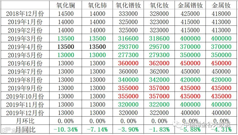 表二 轻稀土系列2018年12月-2019年12月份挂牌价格 元/吨