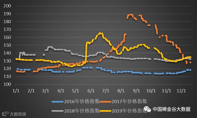 本周有五个交易日,稀土价格指数分别为134.8、134.9、134.7、134.7、134.8,价格指数小幅振荡。稀土价格指数年度走势及近四年同期价格走势见20181220-20191220区间稀土价格指数走势图、2016-2019年稀土价格指数同期走势图。