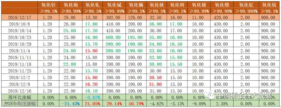 与2018年12月17日挂牌价同比分析:氧化钐、氧化钬、氧化钇、氧化钪同比价格不变;其它氧化物同比价格均有涨跌,其中同比价格涨幅超过20%的有氧化钆(涨21.05%)、氧化铽(涨29.14%)、氧化镝(涨50.79%),氧化铕价格同比下降,降幅为21.43%。
