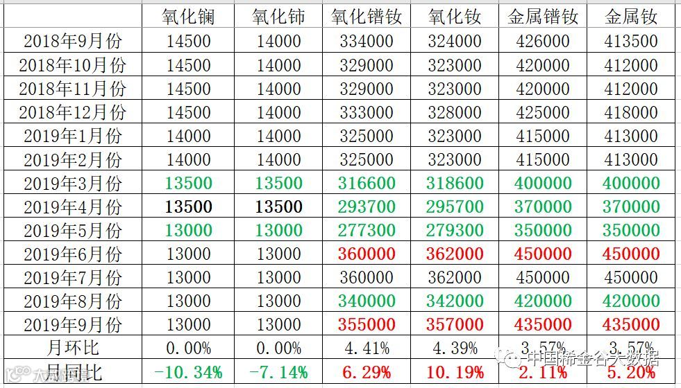 表二 轻稀土系列2018年9月-2019年9月份挂牌价格 元/吨