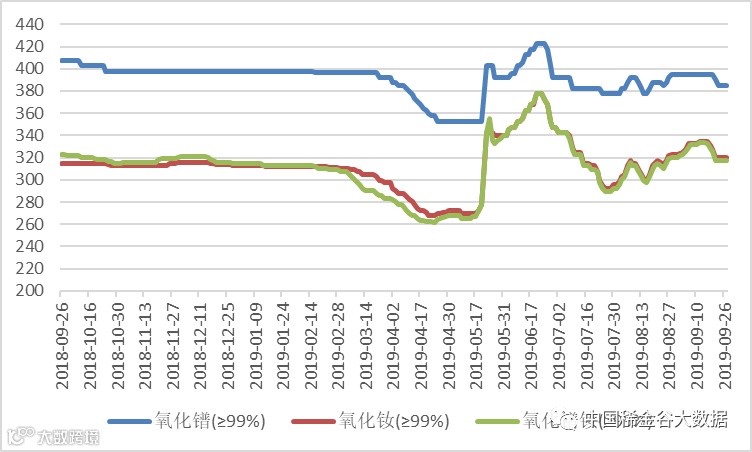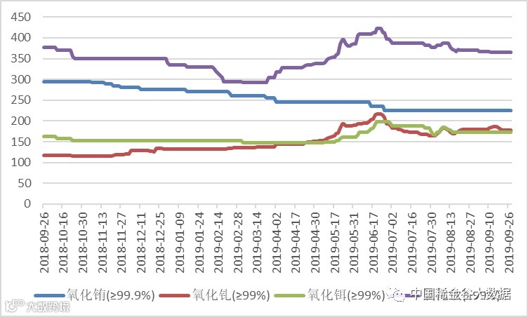 与2018年9月17日挂牌价同比分析:氧化钐、氧化钇、氧化钪同比价格不变;其它氧化物同比价格均有涨跌,其中同比价格变化超过20%的均为上涨, 有氧化钆(涨38%)、氧化铽(涨39%)、氧化镝(涨73%)。