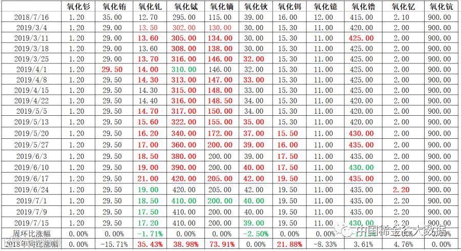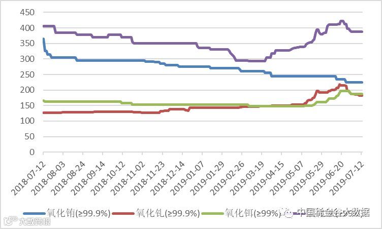 表一 中重稀土氧化物2019年3月-2019年7月挂牌价格 万元/吨