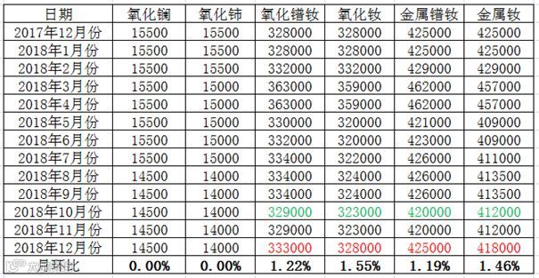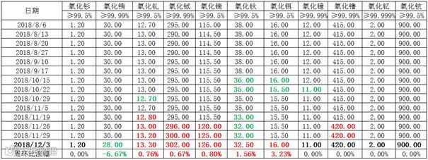 北方稀土市场营销部于12月10日发布12月份轻稀土挂牌价格(表二),与上月相比,镨钕系报价均不同程度上涨。
