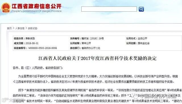 近日,江西省人民政府表彰2017年度江西省科学技术奖104项优秀科技成果,其中自然科学奖20项(一等奖1项,二等奖9项,三等奖10项);省技术发明奖7项(一等奖1项,二等奖2项,三等奖4项);省科技进步奖77项(一等奖14项,二等奖20项,三等奖43项)。