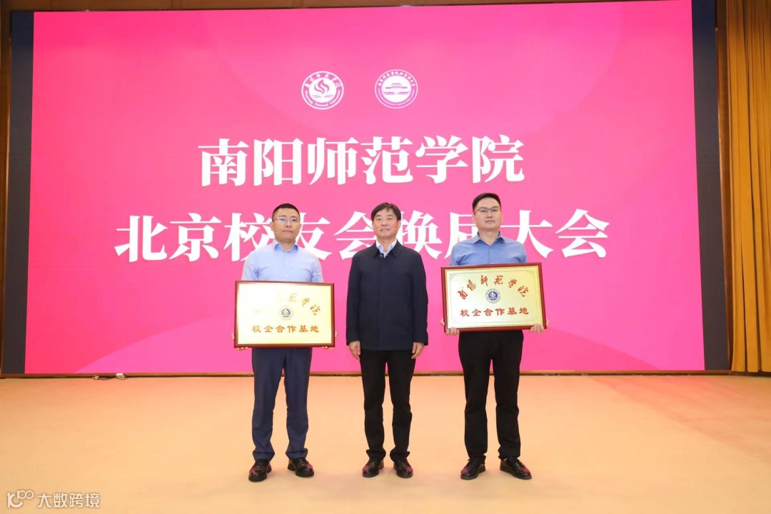 (南阳师范学院校企合作办公室主任李超教授(中间)颁发牌匾)