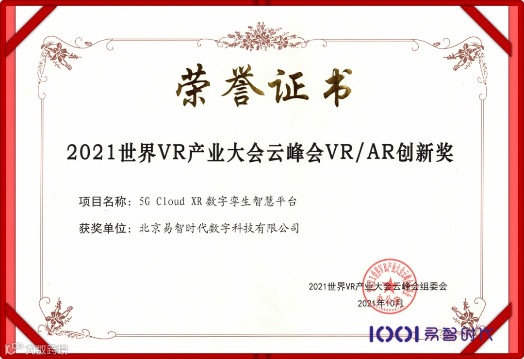 易智时代“5G Cloud XR数字孪生智慧平台”在2021世界VR产业大会荣获“VR/AR创新奖”