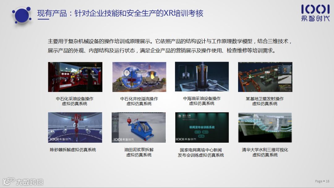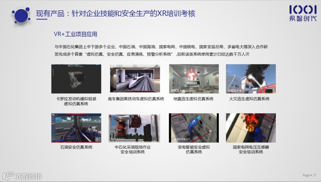 易智时代针对企业技能和安全生产的XR培训系统,主体面向以采油-炼油-售油为核心业务的上中下一体化石油安全培训系统,进而演变衍生出以电力安全,消防安全为主线的工业安全类生产体系。另外针对技能型企业,公司在以汽车、动车、航空航天为主要核心的动力维修制造也设有专业的技能培训系统,致力于打造将物联网,大数据依托于虚拟现实平台展现的综合性企业技能培训体系。