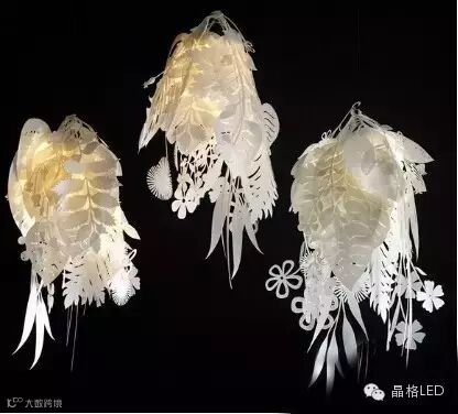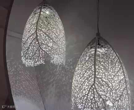 伦敦的设计师TordBoontje做过不少与植物有关的吊灯,都是通过3D打印完成的。他的Bouquet像是将花瓶里的植物倒挂下来,上面有至少20种不同的叶子或花。每一串上面带有一个小勾,组合在一起有剪纸的感觉。