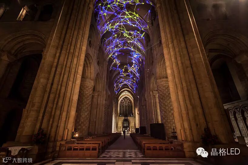这个“复杂的网”就像我们常在建筑或建模中见到的三维的网格,不同颜色的点、线、面组合在一起,所形成的三角形、四边形和其他多边形互相堆叠,不断变化。它还是个互动装置,通过传感器来感知游客在教堂中殿的移动,游客们步伐改变,拱顶上的灯光也会变成另一种样子。看起来有点像虚拟现实的世界。