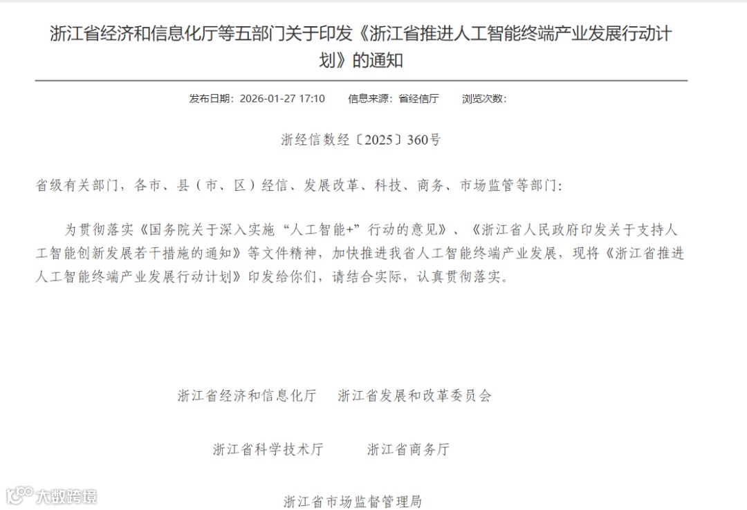 人工智能终端是具备主动感知理解、多模态自然交互、智能化服务和自主学习进化等能力的新型终端产品,是新一轮科技革命和产业变革的重要载体。根据《国务院关于深入实施“人工智能+”行动的意见》、《浙江省人民政府印发关于支持人工智能创新发展若干措施的通知》等文件精神,为加快推进我省人工智能终端产业发展,培育形成新质生产力,特制定本行动计划。
