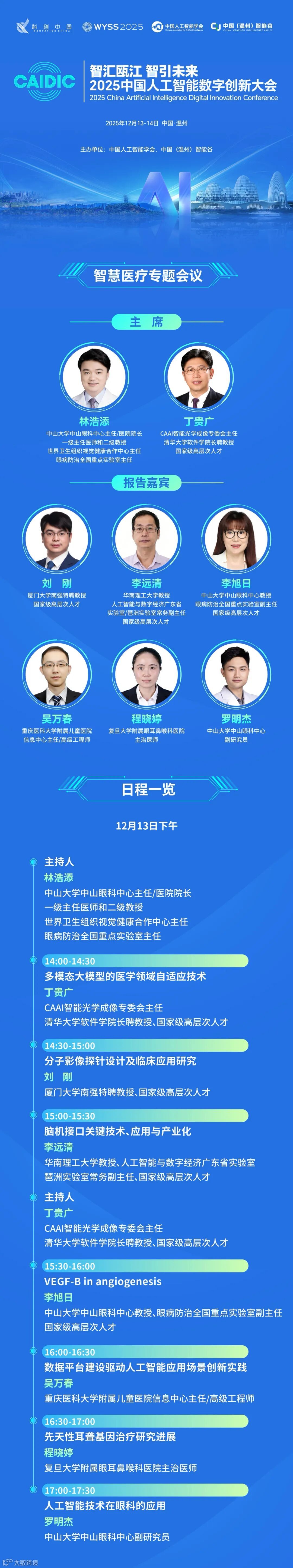 CAAI智能光学成像专委会主任、清华大学丁贵广教授将介绍多模态大模型在医学专业领域的自适应技术及其与应用。厦门大学刘刚教授将介绍分子影像探针的设计原理及其在临床诊断中的应用成果。华南理工大学李远清教授将阐述脑机接口的核心技术突破及其在医疗康复领域的产业化进展。中山大学中山眼科中心李旭日教授将探讨血管内皮生长因子B在血管生成过程中的具体作用机制。重庆医科大学附属儿童医院信息中心吴万春主任将展示通过数据平台建设推动医疗人工智能场景落地的实践案例。复旦大学附属眼耳鼻喉科医院主治医师程晓婷将阐述先天性耳聋基因治疗领域的最新研究进展与突破。中山大学中山眼科中心罗明杰副研究员将介绍人工智能技术在眼科疾病诊断与治疗中的创新应用。