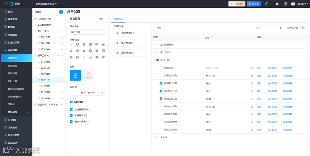 所有功能通过列表的形式进行展现,可配置功能别名以及角色权限。
