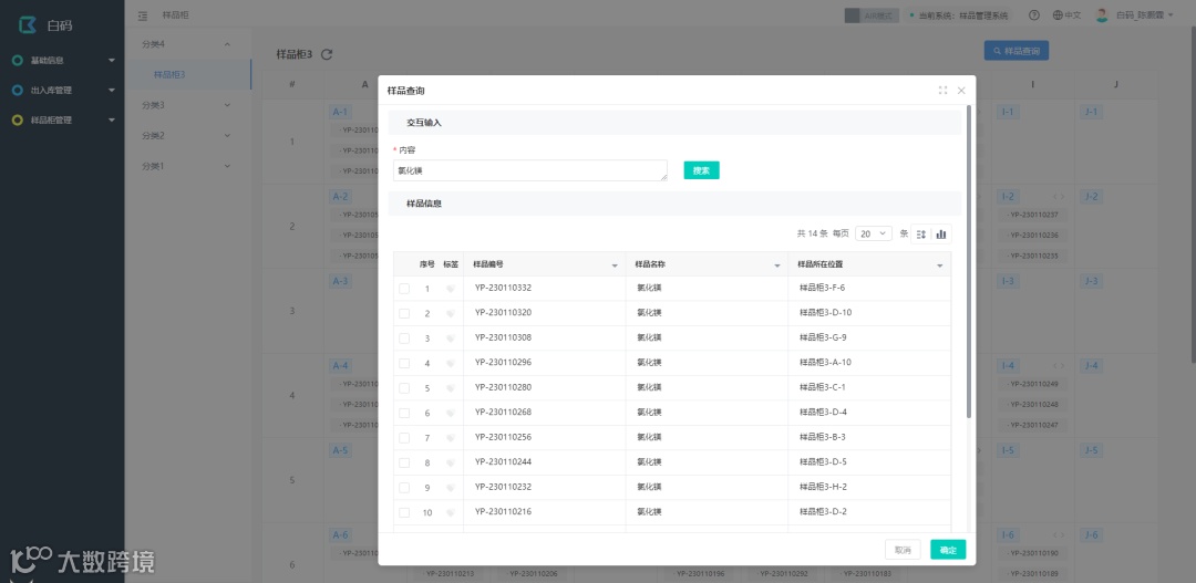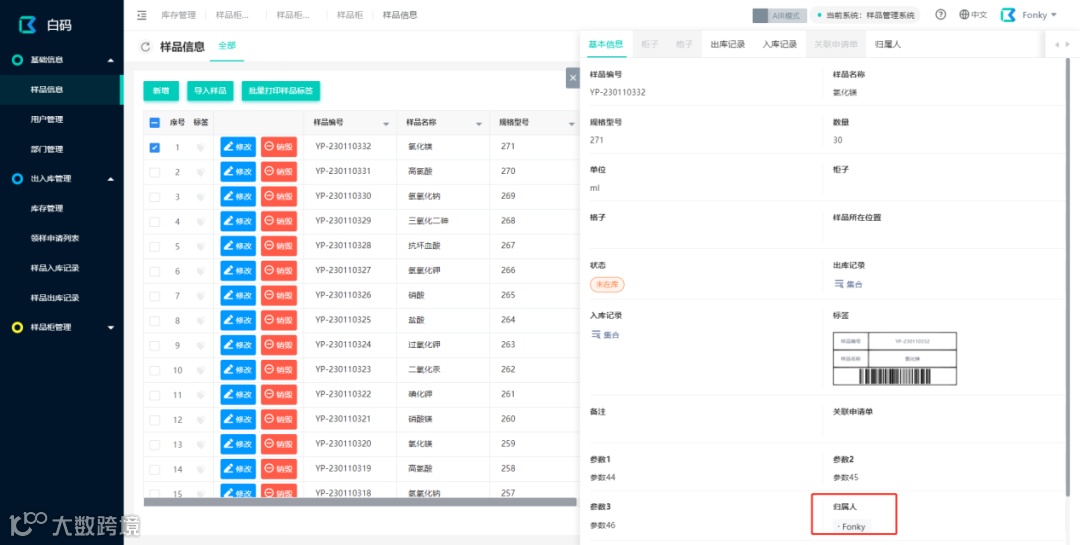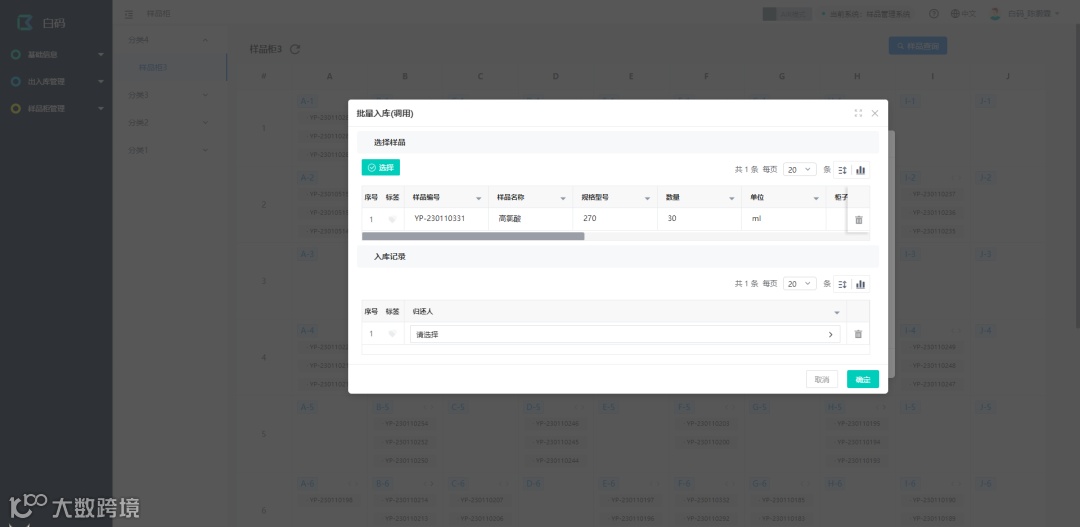 样品标签全程溯源:通过扫描每个样品的唯一标签,出入库流程一目了然,从此告别手动选择出入库。