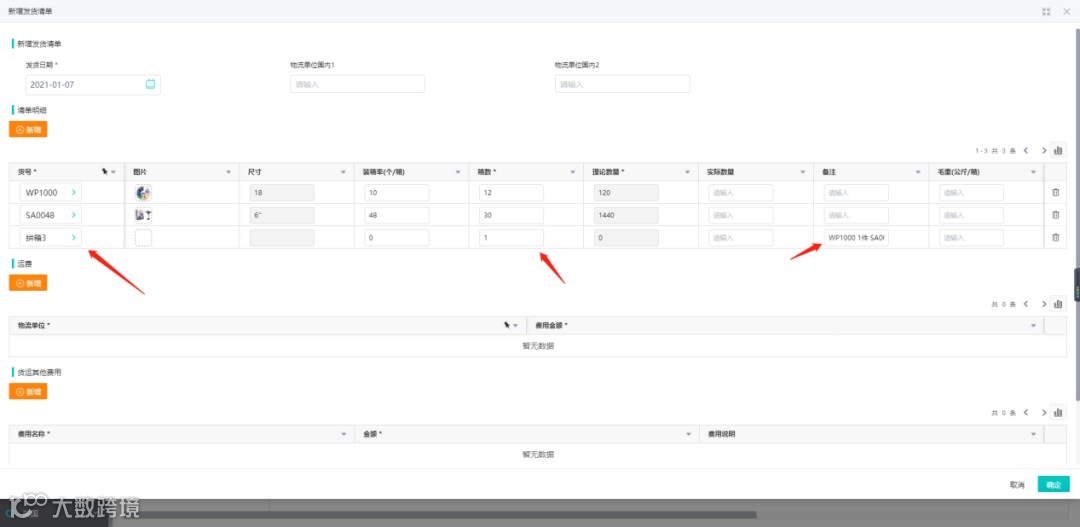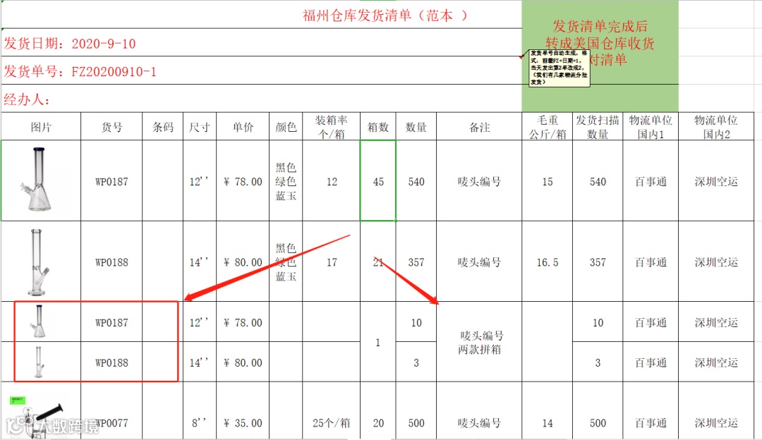 1.针对“拼箱”的问题,为了发货清单明细不出现重复的商品,在商品列表中添加“拼箱”的虚拟商品,并在后面的备注中填写该拼箱的商品信息;