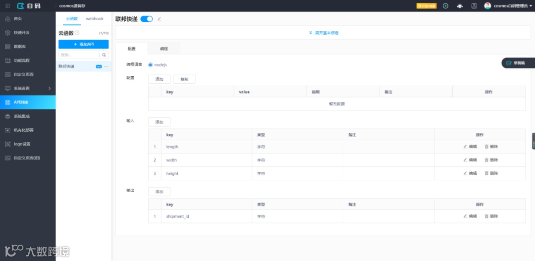 6.为了减少重复填写打包箱参数,白码通过API对接的方式,将打包箱的参数发送到联邦快递的createshipment接口来创建货件;