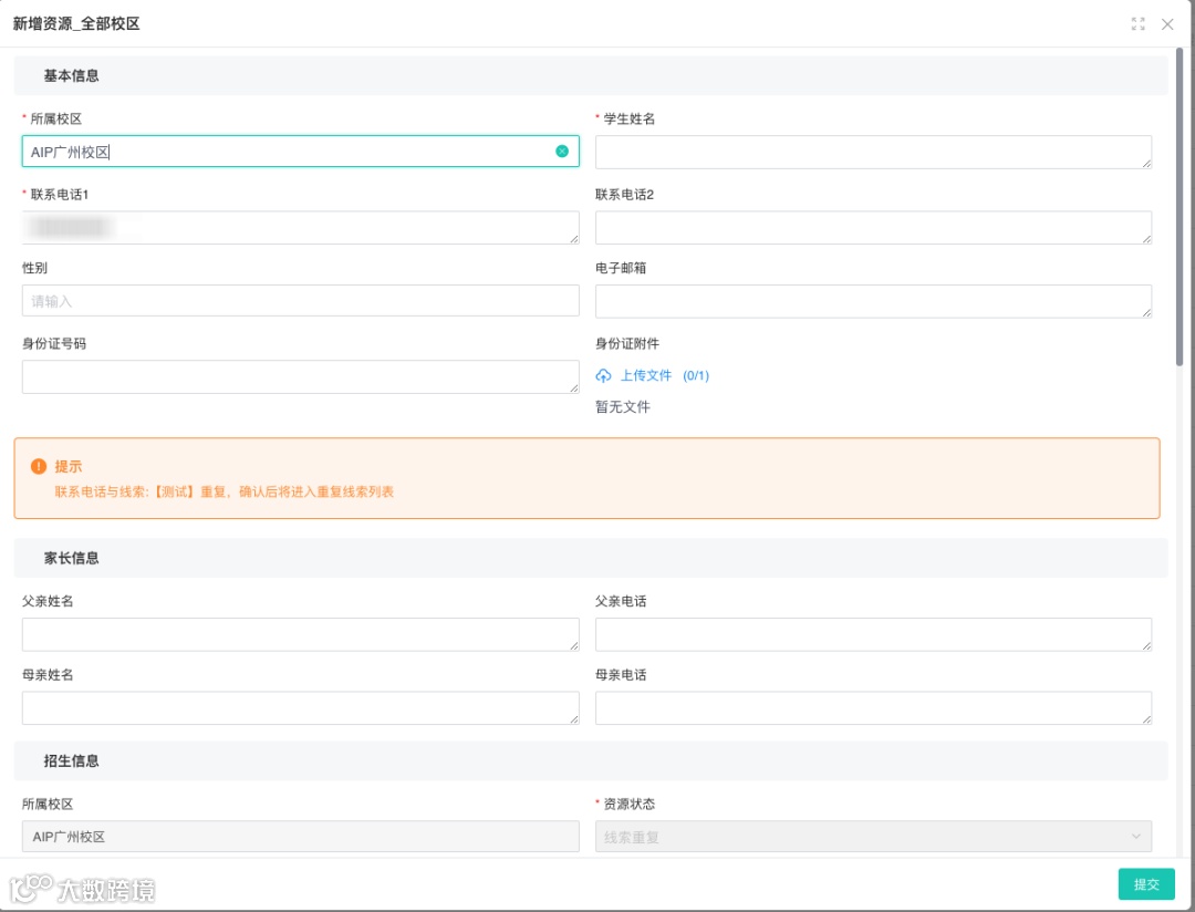 重复资源去重功能,能够避免多渠道进入的同一资源线索分配给不同的老师跟进,大大减少了资源浪费。