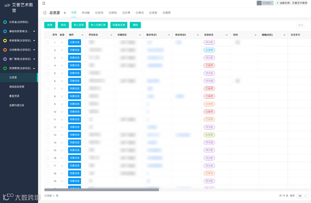 对线索流转进行全流程管理。记录了待沟通、咨询、探校、报名、约考、录取、缴费的每个步骤,更精准有效的管理线索跟进情况。