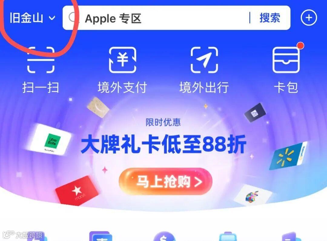 打开支付宝,定位定美国: