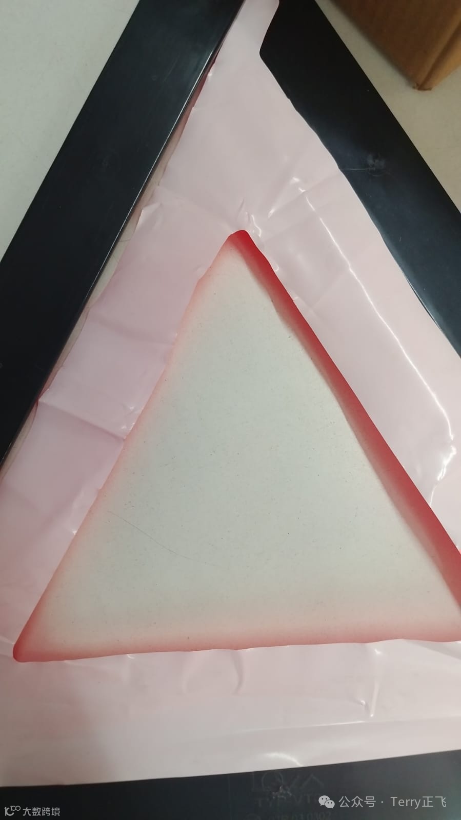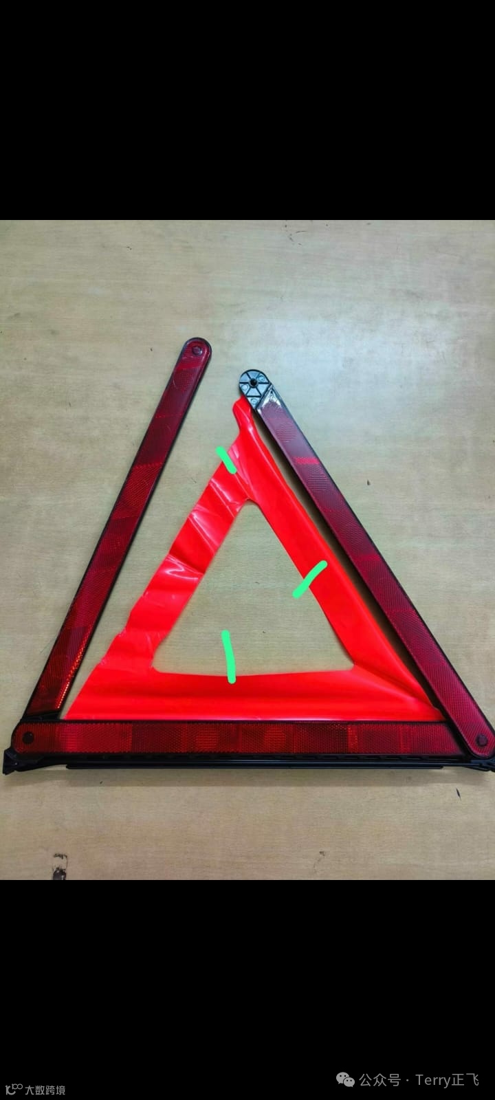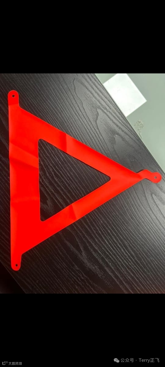 3. 需求产品(如图):PEVA荧光布/膜,用于汽车三角架,裁切成品和未裁切原料都可以。客户英文描述:PEVA Fluorescent coated used in manufacturing Warning triangle, it's one of the bills of material for making a complete triangle set.