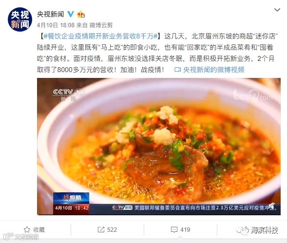 据海滨科技了解到,1月底,武汉刚封城,全国开始限制出门,北京眉州东坡酒楼就开始做起来了卖菜。