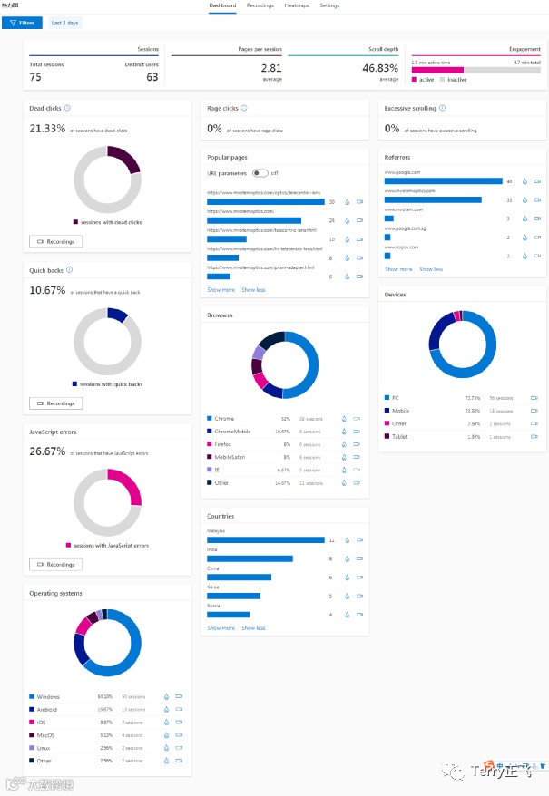 再比如热力图,客户来源归属,用的啥设备,来自啥鸟地方……更恐怖的是,客户怎么访问你页面,点了啥,哪里草草看过,哪里依依不舍,还可以有视频可以记录---那你知道后面该干嘛了吧。