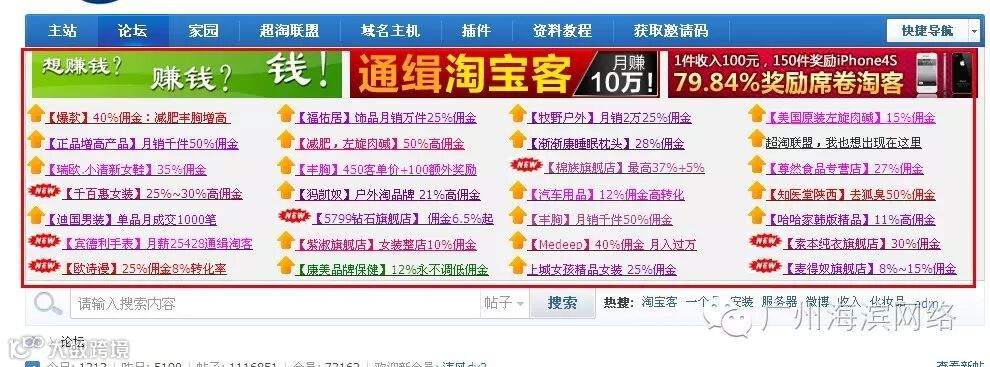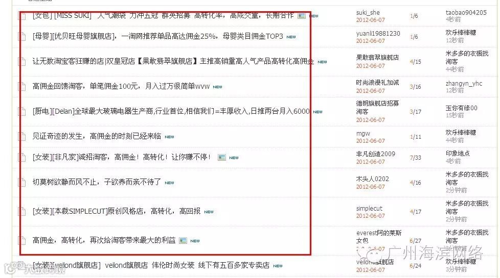 这个方法已经被许多店铺熟练掌握,我们在淘宝联盟社区经常看到一些卖家的招募帖,这里笔者在这里要提醒的是,第一、尽量多的寻找淘宝客相关的网站进行招募帖宣传,如chinaz、a5、seowhy等都有专门的淘宝客交流板块,寻找站长人群集中的论坛进行推广;第二、招募帖注意标题,尽量要编辑一个吸引人的标题,但不能标题党,吸引感兴趣的淘宝客站长浏览。
