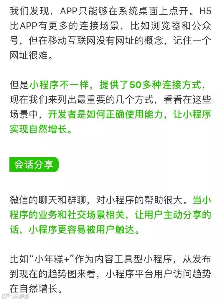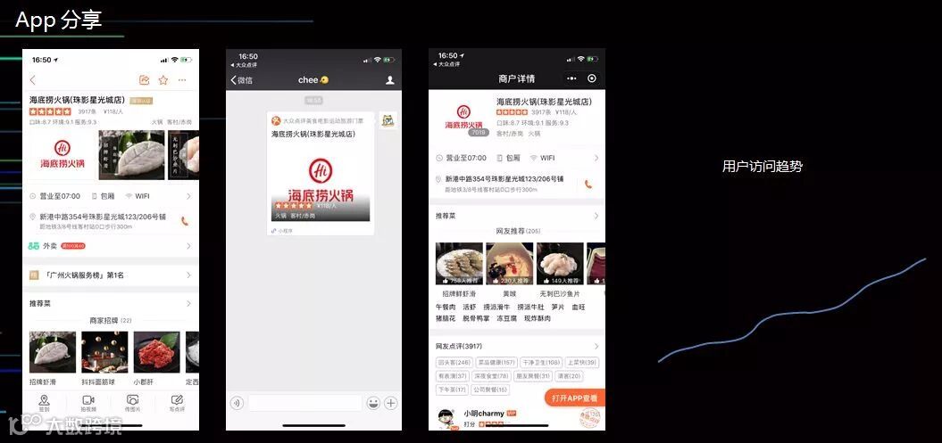 还有一个很重要的场景,就是APP分享。大众点评的APP,分享出来就是小程序。很多核心用户不一定要用APP,也可以通过小程序触达,因为小程序具备更多的场景和连接方式。