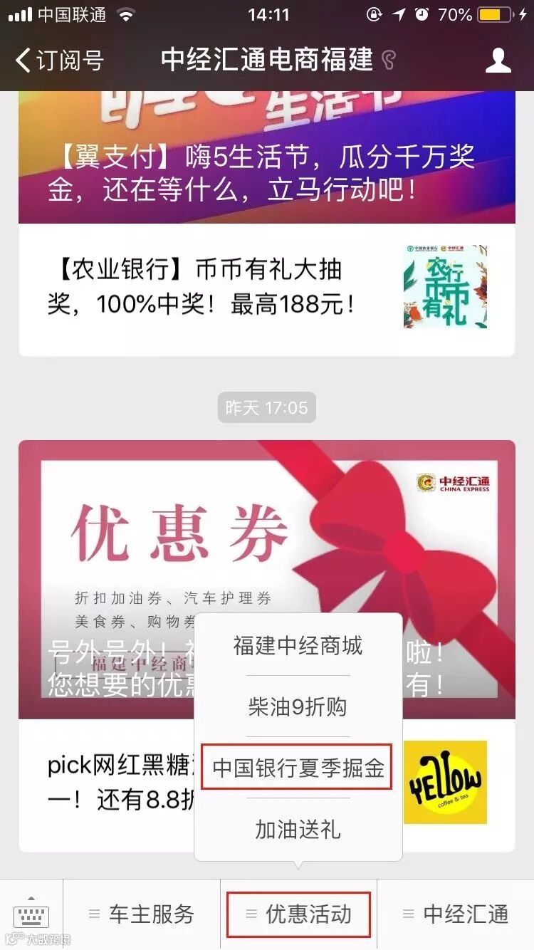 进入微信号“中经汇通电商福建”→菜单栏“优惠活动”→“中国银行夏季掘金”