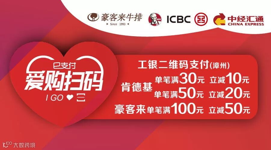 活动内容:活动期间,至漳州地区指定肯德基、豪客来门店,通过工行融e联或融e行(手机银行)APP在中经汇通POS机上使用二维码支付,享受肯德基单笔消费满30元立减10元,满50元立减20元;豪客来单笔消费满 100元立减50元。