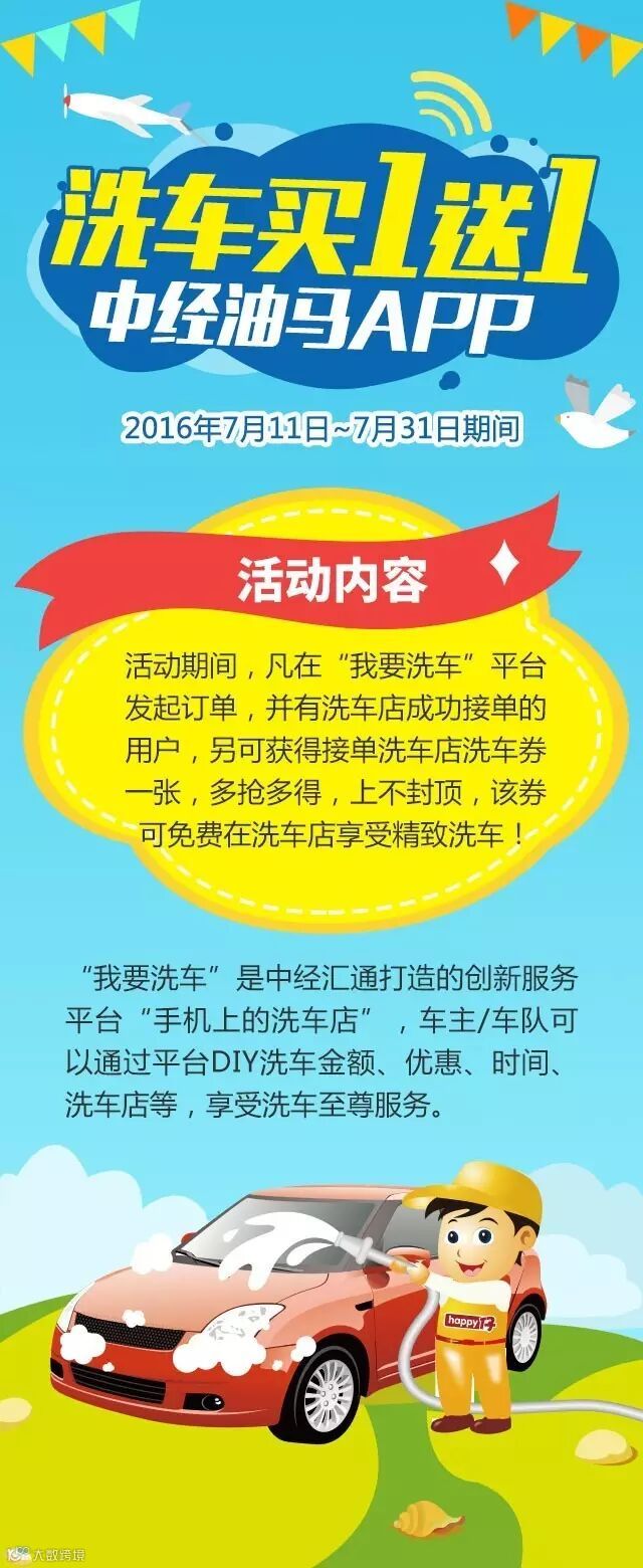 导读:2016年7月11日~7月31日期间,凡在“我要洗车”平台发起订单,并有洗车店成功接单的用户,另可获得接单洗车店洗车券一张,多抢多得,上不封顶,该券可免费在洗车店享受精致洗车!