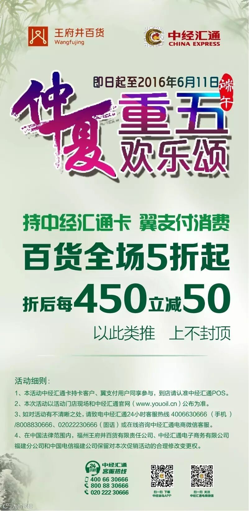 导读:即日起至2016年6月11日,持中经汇通卡、翼支付消费,百货全场五折起,折后每450立减50!