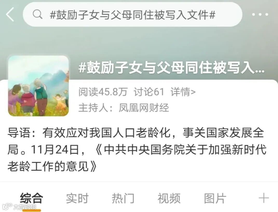 近日,《中共中央国务院关于加强新时代老龄工作的意见》正式发布,就构建老年友好型社会,研究制定住房等支持政策,鼓励成年子女与老年父母就近居住或共同生活等提出一系列政策意见,引发热议。