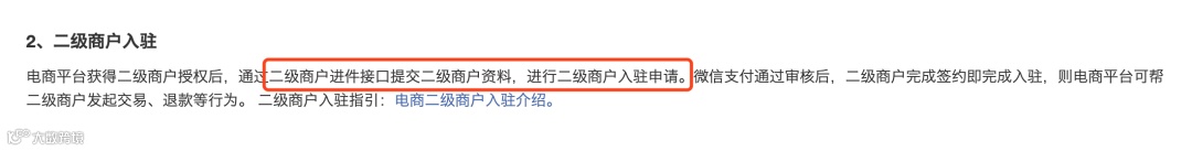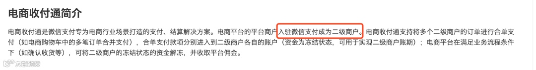 这边有个坑,二级商户的定义和 微信支付商户不是同一概念,这边的二级商户只要提供证件信息,然后服务商可以直接把这个信息变成 微信支付商户,类似私有化的概念(在这个电商收付通服务商下)。