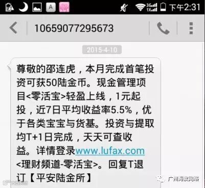 这个广告是陆金所给我发的,而且还是经常发,非常的讨厌。我是前段时间在猪八戒网做了一个CPA的任务,就是这个网站,只是为了挣钱的。可是,做完这个任务却发现以后手机经常收到这样的垃圾短信,看的我都烦,想禁止也没有办法,后来也只能给拉黑了还好点。