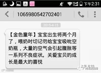 金色童年的知信营销可以说非常的成功,因为他们针对的是我们这些有孩子的父母,他们知道我们需要什么。所以,他们就以短信的方式一个月左右的时间发一次健康提醒,及需要注意的地方。一个月的时候注意什么,二个月的时候注意什么,他们几乎每个月都会提醒一次,而不是像有些商家,恨不得一天发几十条短信。