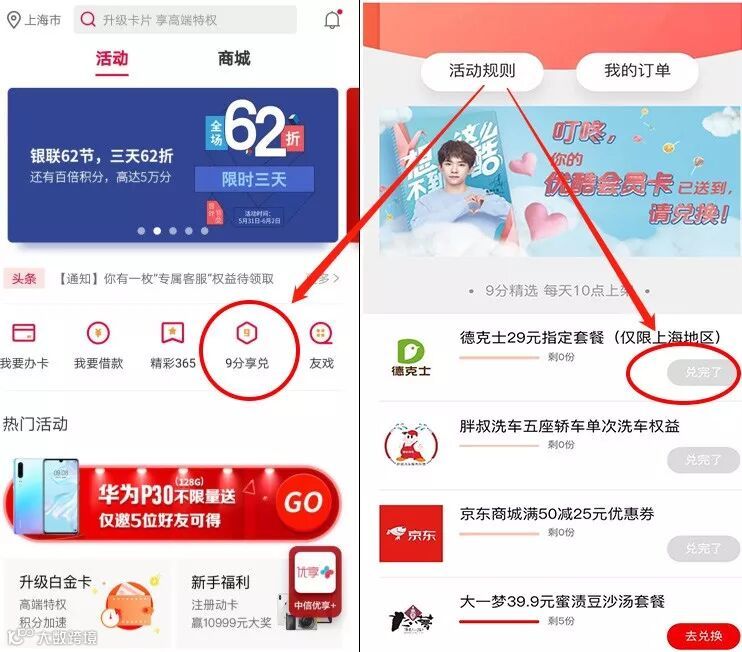 2019年6月4日起至2019年6月30日,中信银行信用卡上海指定客户在活动期间内的每自然月在餐饮娱乐类、百货超市类、商旅类指定商户消费或微信、支付宝交易满足条件,即可获得9分享兑权益。