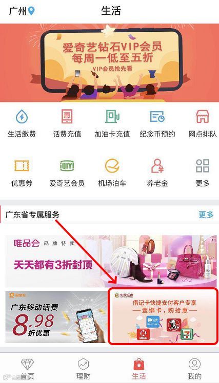 活动对象在中国银行手机银行“生活频道”广东专属服务“壹绑卡, 购拾惠”栏目支付1元即可购买10元话费、KFC(肯德基)、7-11便利店、ok便利店中的一种。活动名额有限,用完即止。
