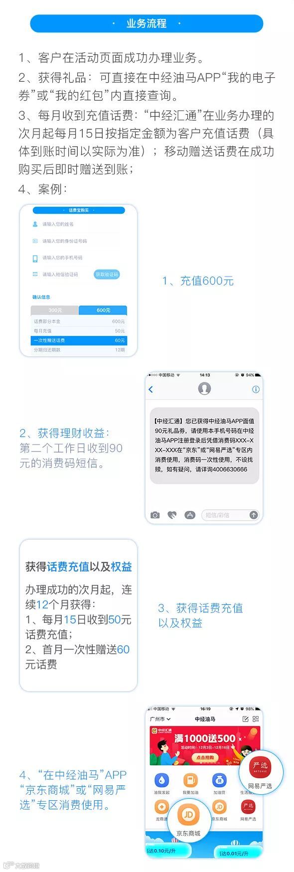 选购600元话费宝套餐,即可获赠60元的话费及90元中经油马APP京东网易严选专区礼品券!