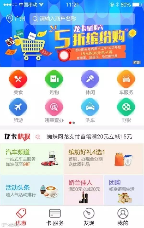 2、点击首页轮播广告图“龙卡星期六,5折缤纷购”进入抢券页面;
