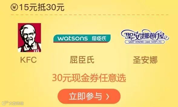 5折购30元KFC、屈臣氏、圣安娜饼屋现金券,