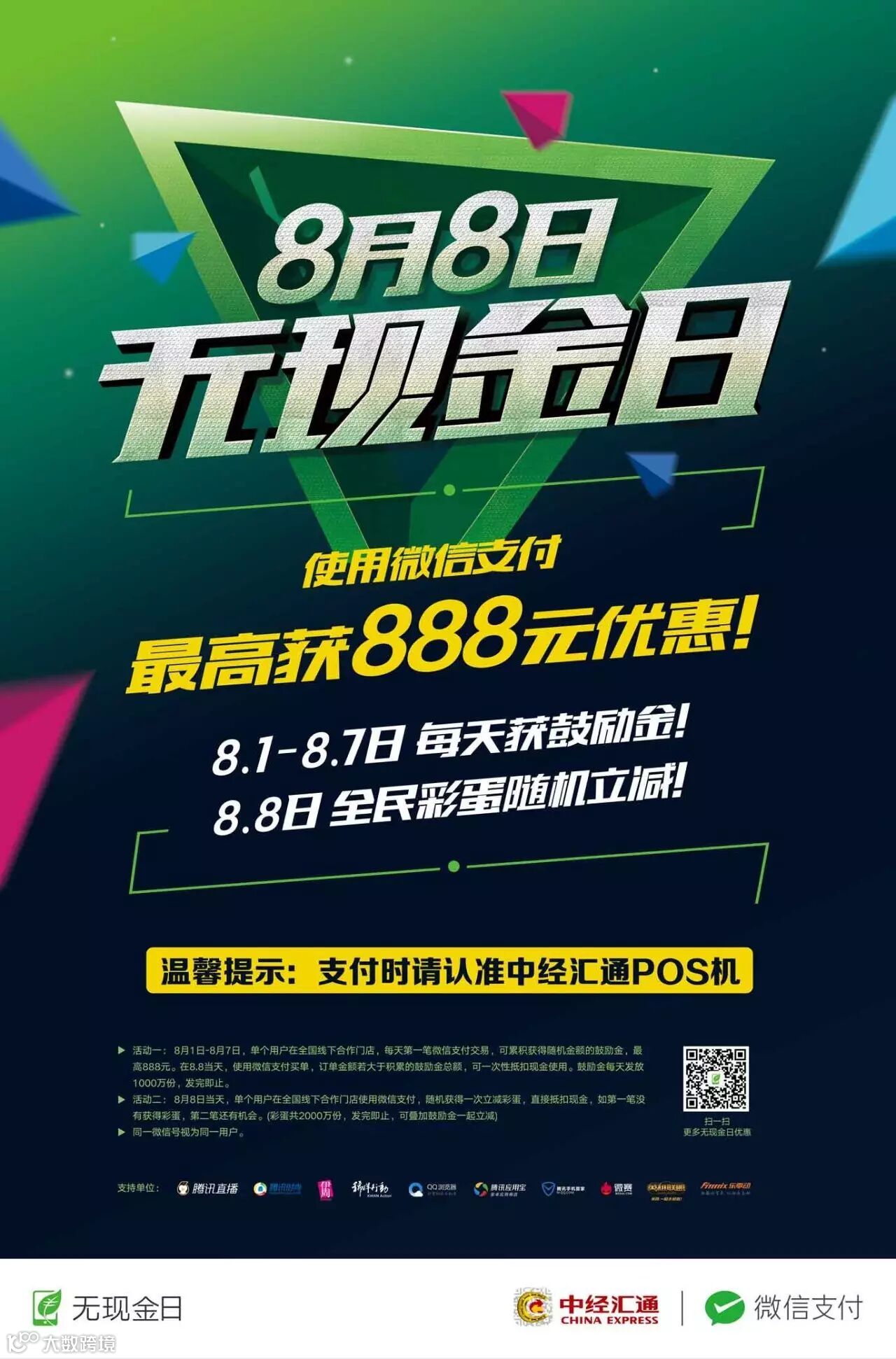 2、8月8日无现金日彩蛋:8.8当天,单个用户在“无现金日”合作门店使用微信支付,随机获得一次立减彩蛋,直接抵扣现金,如第一笔没有获得彩蛋,第二笔还有机会(彩蛋共2000万份,发完即止,可叠加鼓励金一起立减);