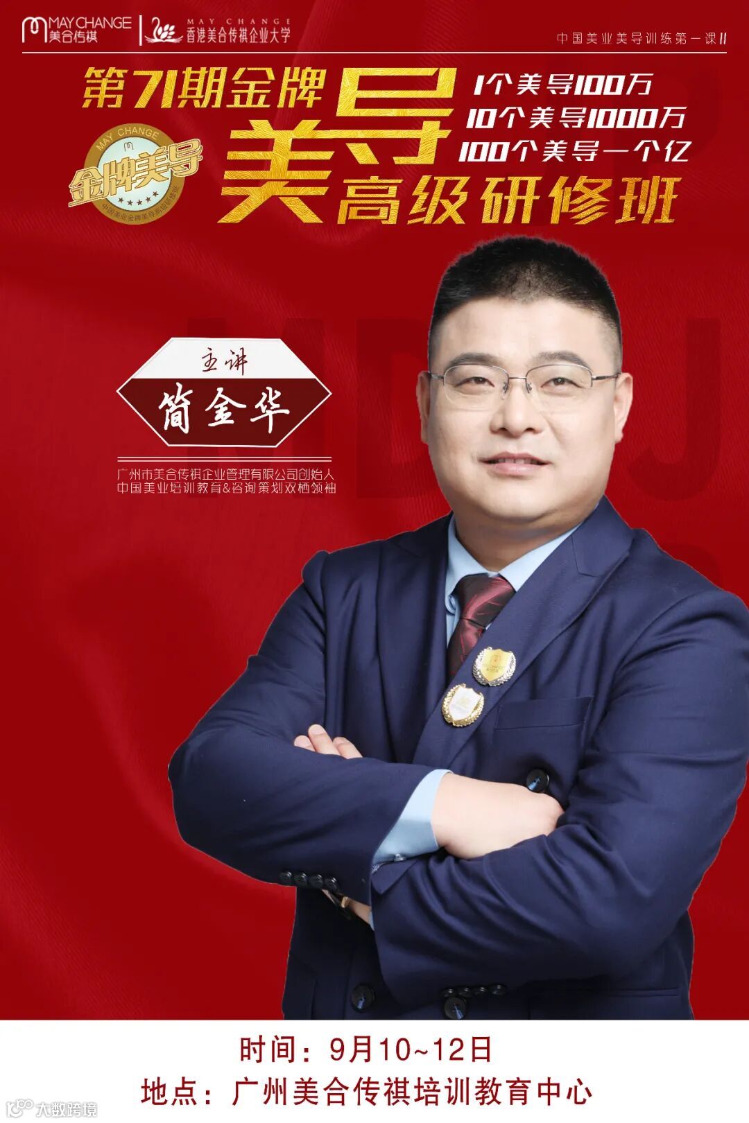 你们好!欢迎您参加美合传祺第71期《金牌美导高级研修班》,美合传祺全体小林人感谢您对本课程的关注和大力支持,并热烈欢迎您的到来。在2021年9月10-12日这3天2夜的时间里,我们将会与大家共同探讨,共同成长,透过学习,成为一名金牌美导。为此,我们会务组也会以最高的服务品质让同学们轻松、快乐的享受学习旅程。美合传祺全体小林人祝您学习愉快!