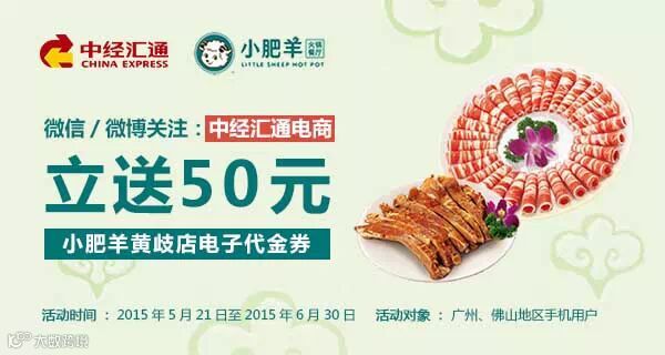 1) 关注“中经汇通电商”官方微信、微博,预留手机号,即可获得由中经汇通送出的小肥羊黄岐店50元电子代金券一张。