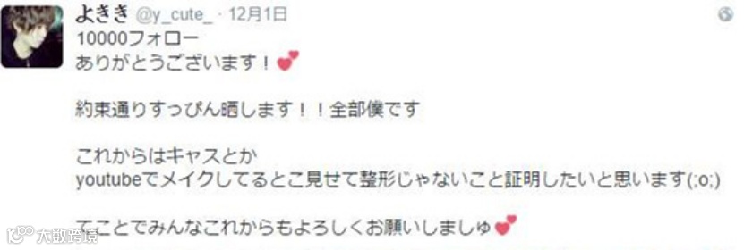 于是,他在自己的Twitter粉丝达到1万的时候,公开自己的素颜照,证明自己的脸并没有动过任何手术。同时也决定开始在YOUTUBE发布自己的化妆过程的视频来加以证明。