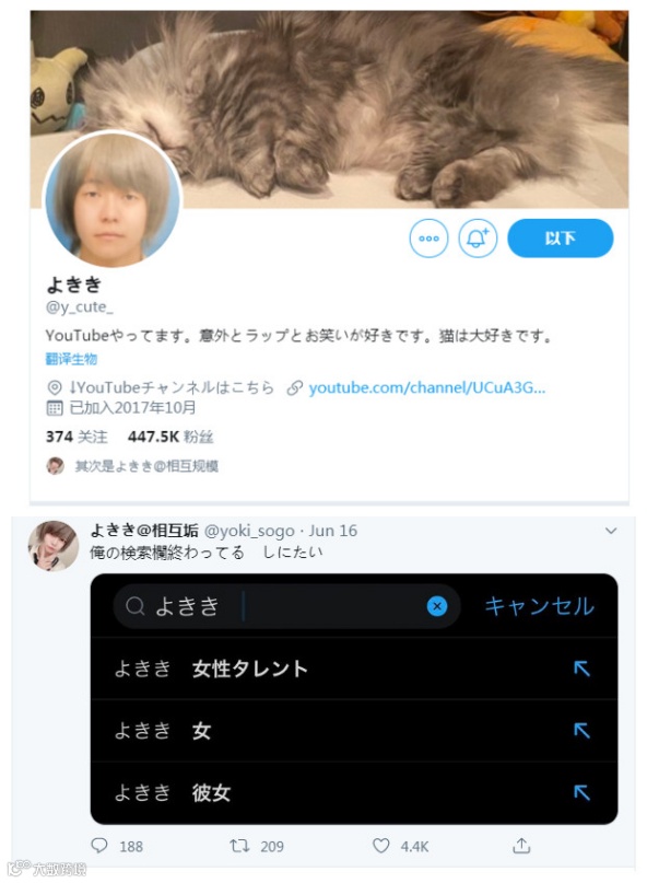 现在Yokiki不仅是一位坐拥百万粉丝的YOUTUBER,Twitter粉丝数更是飙升到现在的447.5k。
