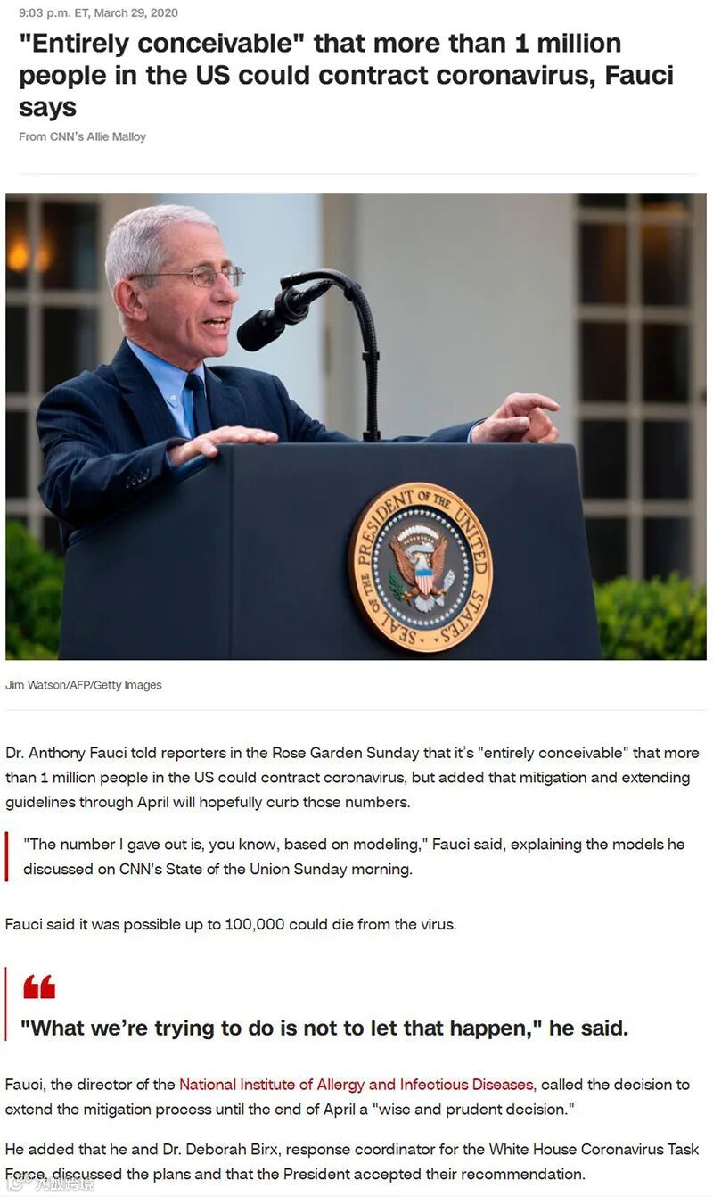 2020年3月29日,Dr. Anthony Fauci(安东尼·福西,医学博士)在玫瑰园告诉记者,在美国有超过100万人可能感染冠状病毒。