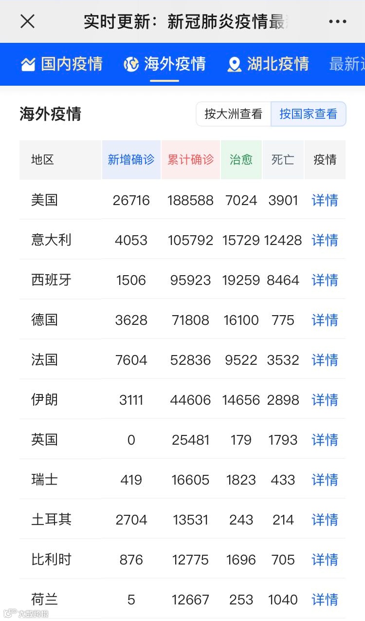 美国疫情现状,人口3.3亿,新冠状病毒累计确认人数188588,累计死亡人数3901人。