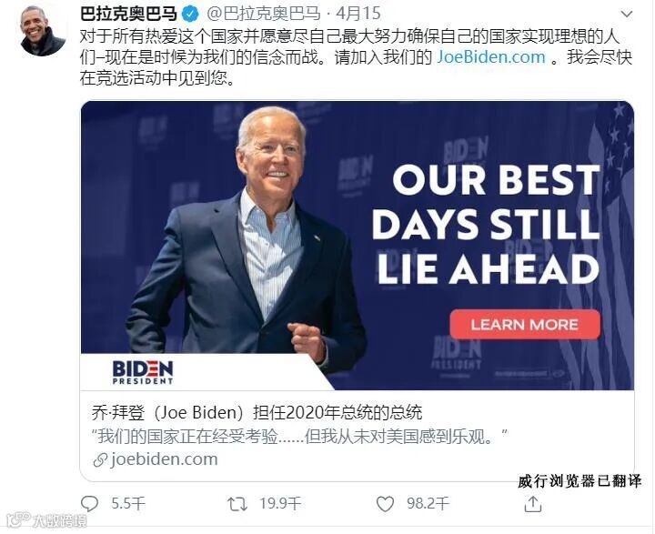 2020年,已经隐身3年的美国前总统巴拉克·奥巴马或将回归美国时局政坛,与现总统特朗普在推特上互撕,为现任副总统拜登公开拉选票,意图结束川普闹剧。