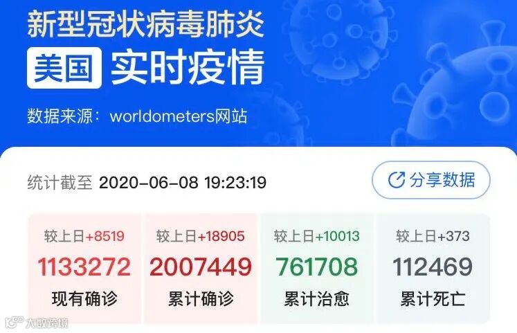 截止目前美国新冠病毒感染者高达2007449人,死亡人数112469人。