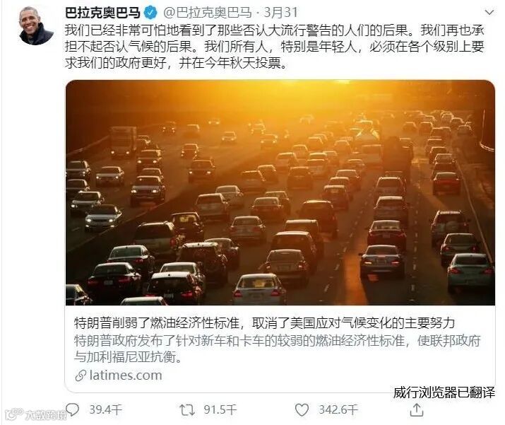 2020年3月31日奥巴马在推特上针对美国大流行发言,并公开为秋季总统选票预热。